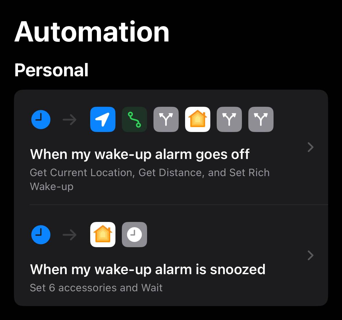 - When my wake-up alarm goes off, start playing music, and turn on smart lighting. I’m working on a daily summary action which reads my calendar and misc. things using the intercom on my Homepod.